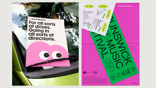 Image: Bright and bold flyer designs that use high-contrast colors and clear imagery.